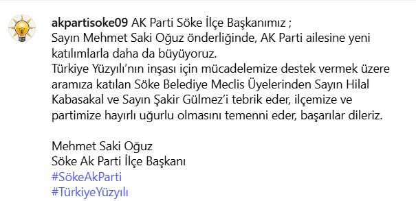 Açıklamada görüşlerine yer verilen AK Parti Söke İlçe Başkanı Mehmet Saki Oğuz,“AK Parti ailesine yeni katılımlarla daha da büyüyoruz. Türkiye Yüzyılı’nın inşası için mücadelemize destek vermek üzere aramıza katılan Söke Belediye Meclis Üyelerinden Sayın Hilal Kabasakal ve Sayın Şakir Gülmez’i tebrik eder, ilçemize ve partimize hayırlı olmasını temenni ederim” ifadelerini kullandı.