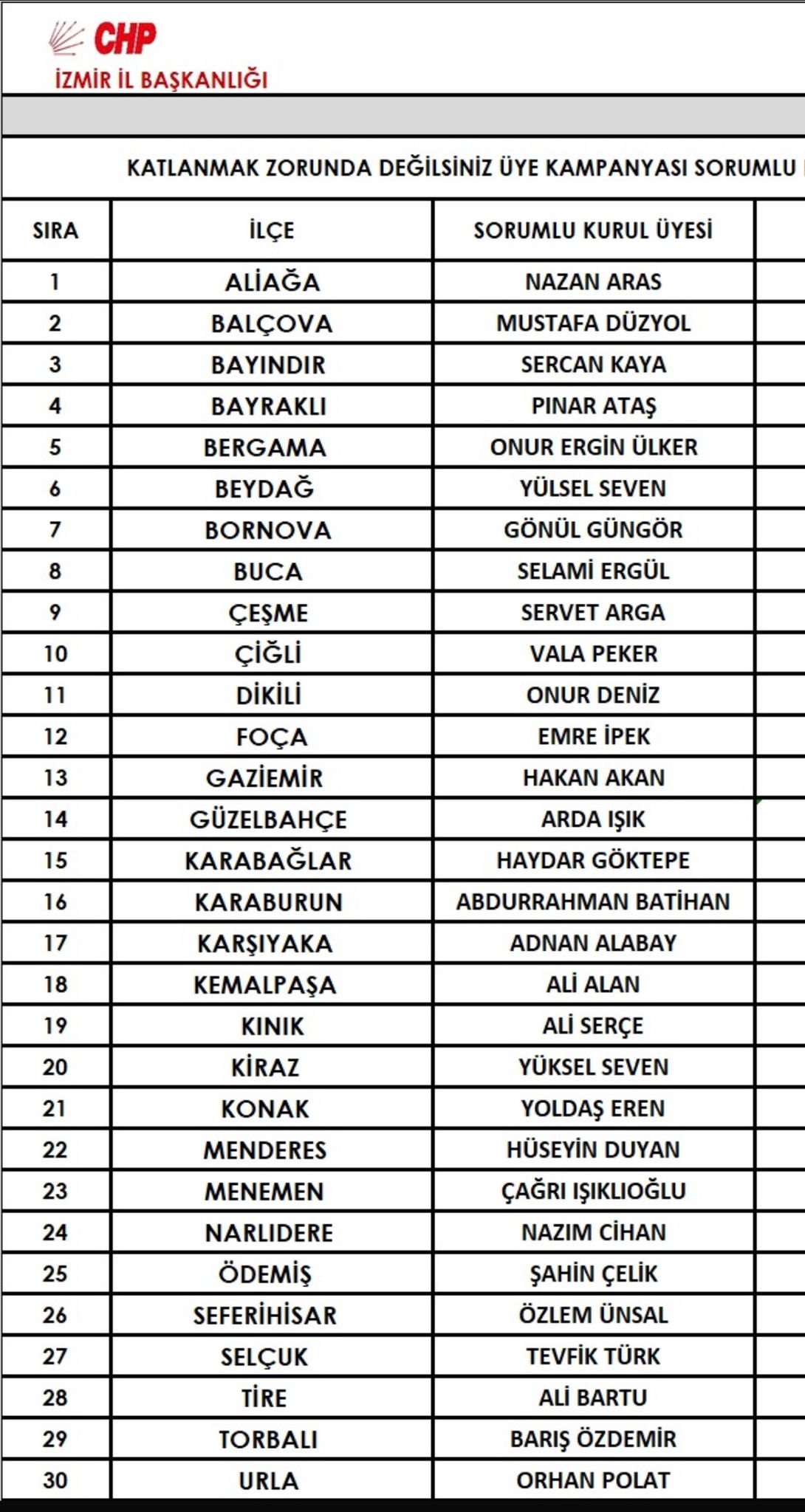 Cumhuriyet Halk Partisi (CHP) Genel Merkezi tarafından başlatılan “Katlanmak Zorunda Değilsiniz” kampanyası İzmir’de büyük bir yankı uyandırdı. İzmir İl Örgütü’nün yoğun saha çalışmaları sonucunda, sadece bir hafta içerisinde 2500 yeni üye partiye katıldı.