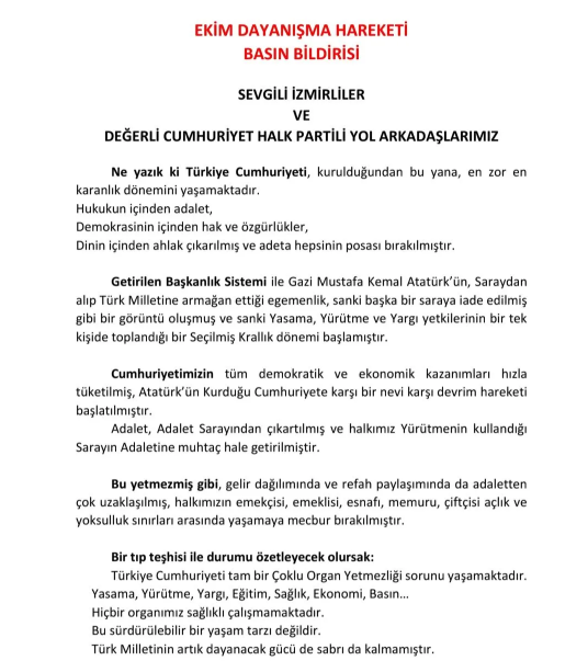 Cumhuriyet Halk Partisi (CHP) İzmir Örgütü’nde; eski bakanlar, eski milletvekilleri, eski il başkanları, belediye başkanları ve parti üyeleri Ekim Dayanışma Hareketi adı altında bir araya geldi. Ekim ayından bu yana 9 toplantı gerçekleştiren Ekim Dayanışma Hareketi, bir basın bildirisi yayınladı. Yayınlanan bildiride CHP üyelerinin partinin Cumhurbaşkanı adayının etrafında toplanması gerektiği ifade edildi.