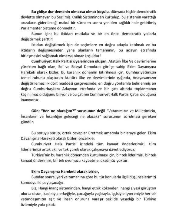 CHP İzmir Örgütü’nde eski bakanlar, milletvekilleri ve parti üyelerinin oluşturduğu Ekim Dayanışma Hareketi, partisinin Cumhurbaşkanı adayının etrafında birleşilmesi gerektiğini vurgulayan bir basın bildirisi yayımladı.