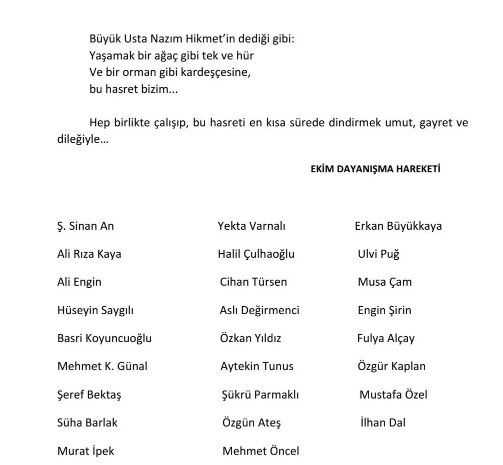 Bildiride şu isimler yer aldı; Ş. Sinan An, Yekta Varnalı, Erkan Büyükkaya, Ali Rıza Kaya, Halil Çulhaoğlu, Ulvi Puğ, Ali Engin, Cihan Türsen, Musa Çam, Hüseyin Saygılı, Aslı Değirmenci, Engin Şirin, Basri Koyuncuoğlu, Özkan Yıldız, Fulya Alçay, Mehmet K. Günal, Aytekin Tunus, Özgür Kaplan, Şeref Bektaş, Şükrü Parmaklı, Mustafa Özel, Süha Barlak, Özgün Ateş, İlhan Dal, Murat İpek ve Mehmet Öncel.