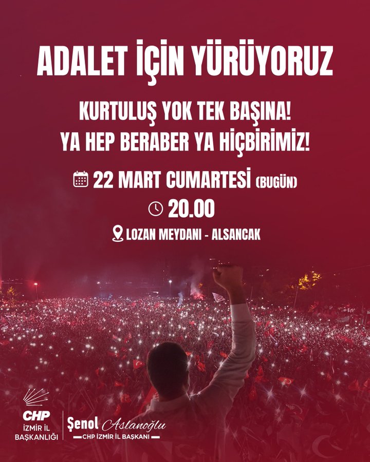 “Bugün daha kalabalık olalım! Sesimizi İzmir’den Türkiye’ye birlikte duyuralım! Adalet için, demokrasi için, geleceğimiz için… Herkesi, tüm İzmir’i Lozan Meydanı’na bekliyoruz. Gelin, bu mücadeleyi birlikte büyütelim!