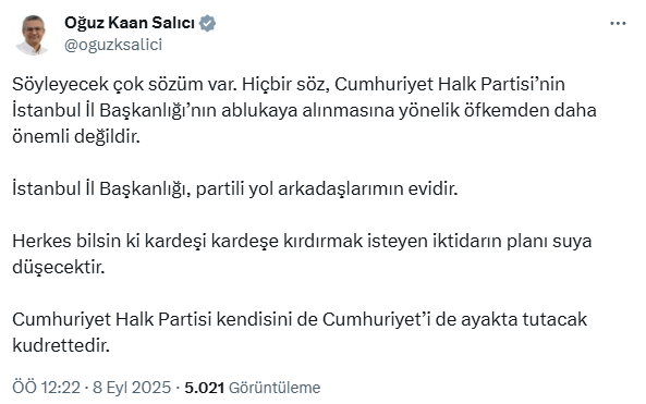 Salıcı açıklamasında, “Söyleyecek çok sözüm var. Hiçbir söz, Cumhuriyet Halk Partisi’nin İstanbul İl Başkanlığı’nın ablukaya alınmasına yönelik öfkemden daha önemli değildir. İstanbul İl Başkanlığı, partili yol arkadaşlarımın evidir. Herkes bilsin ki kardeşi kardeşe kırdırmak isteyen iktidarın planı suya düşecektir. Cumhuriyet Halk Partisi kendisini de Cumhuriyet’i de ayakta tutacak kudrettedir” ifadelerini kullandı.