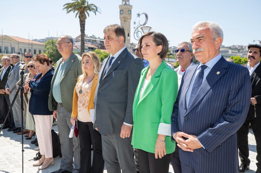 Saygı duruşunda bulunulması ve İstiklal Marşı’nın okunmasının ardından İzmir Gazeteciler Cemiyeti Başkanı Dilek Gappi tarafından anıta çelenk konuldu.