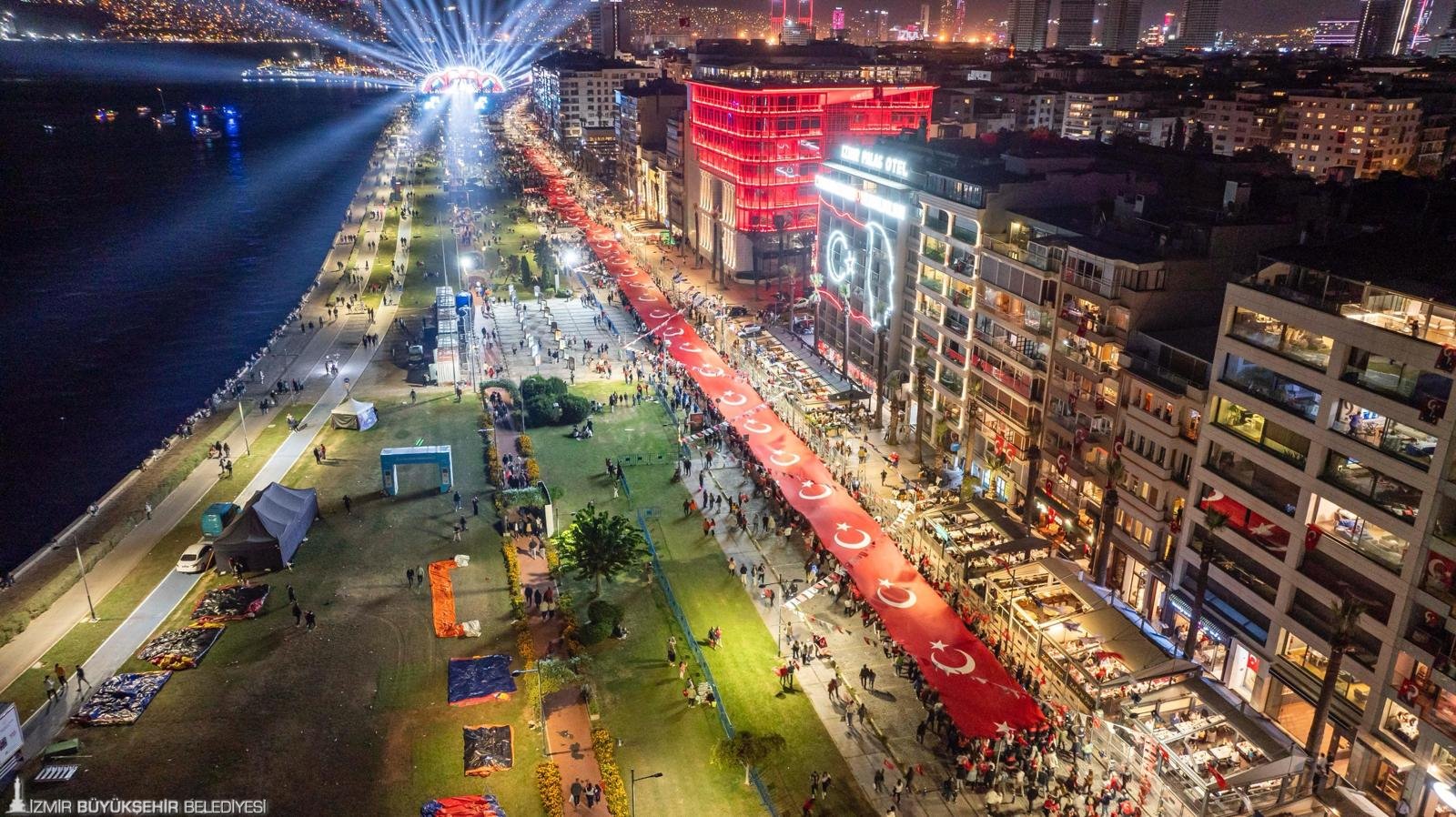 29 Ekim Cumhuriyet Bayramı kutlamaları ve geçit töreni ise saat 10.00’da Cumhuriyet Meydanı’nda başlayacak. Programda; protokol konuşmaları, öğrencilerin şiir okumaları, halk oyunları gösterileri ve dans gösterileri yer alacak. Ege Ordusu ve Garnizon Komutanlığı Bandosu 102. Yıl konseri ise Konak Atatürk Meydanı’nda saat 17.00’de başlayacak. Protokol ve yurttaşlardan oluşan kortej, Hükümet Konağı önünde saat 20.00’de toplanarak İzmir Büyükşehir Belediye Bandosu eşliğinde Alsancak istikametine doğru yürüyecek. Kortej, Konak Pier AVM’nin önünde 350 metrelik Türk bayrağı ve fener alayı ile birleşecek ve dev yürüyüş Cumhuriyet Meydanı’na doğru devam edecek. Cumhuriyet coşkusu, saat 21.00’de Gündoğdu Meydanı’nda düzenlenecek Haluk Levent konseri ile doruğa çıkacak.