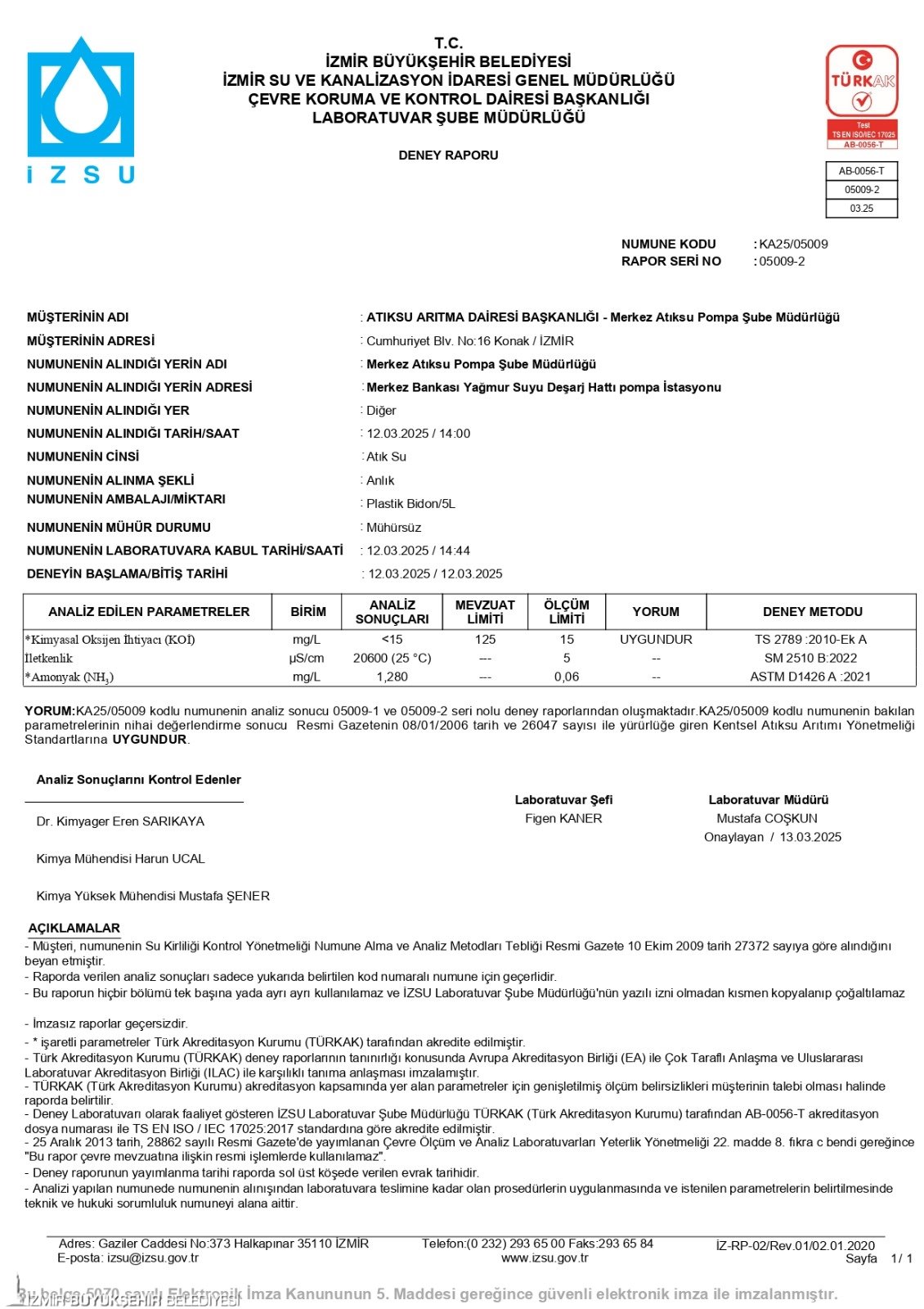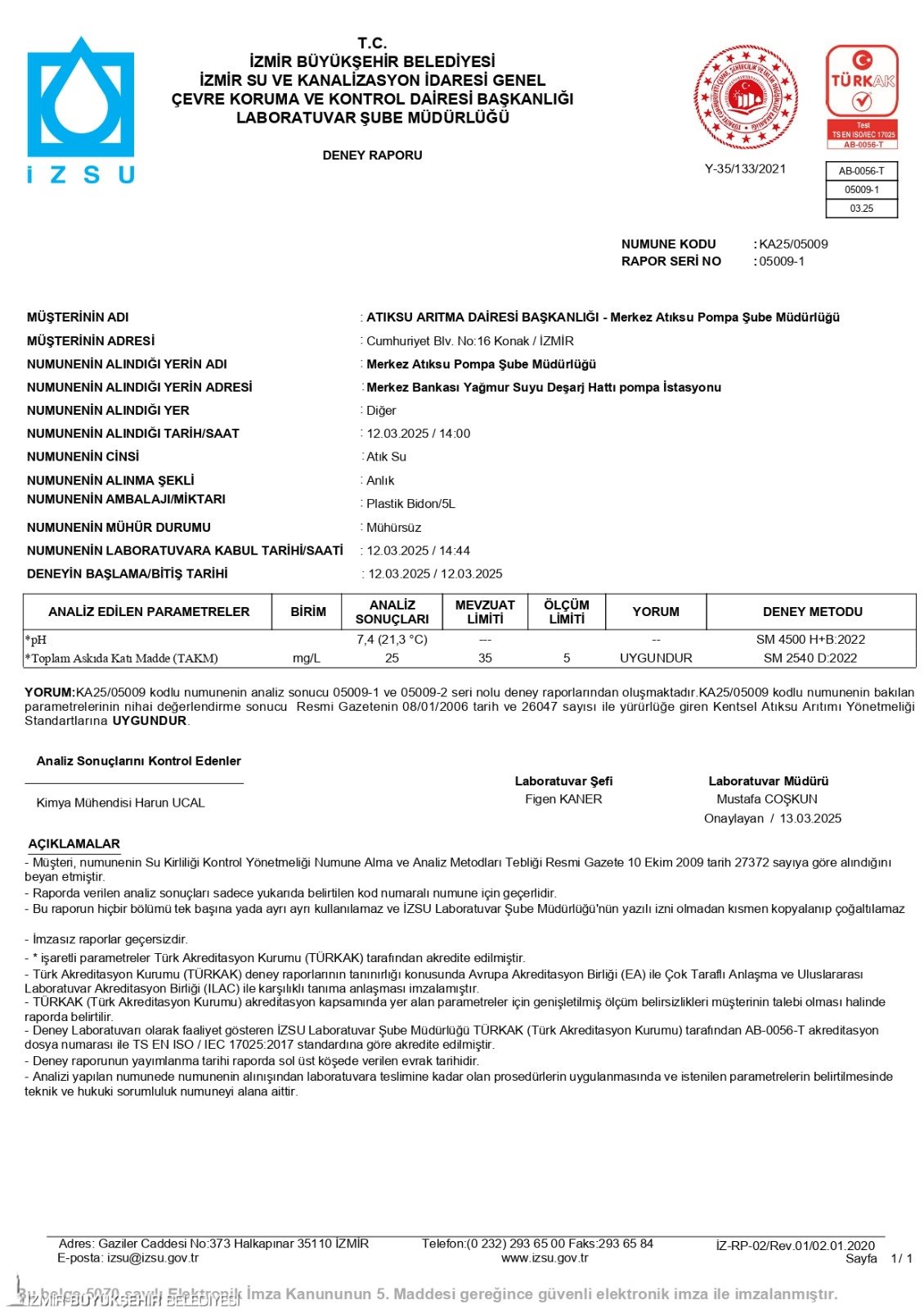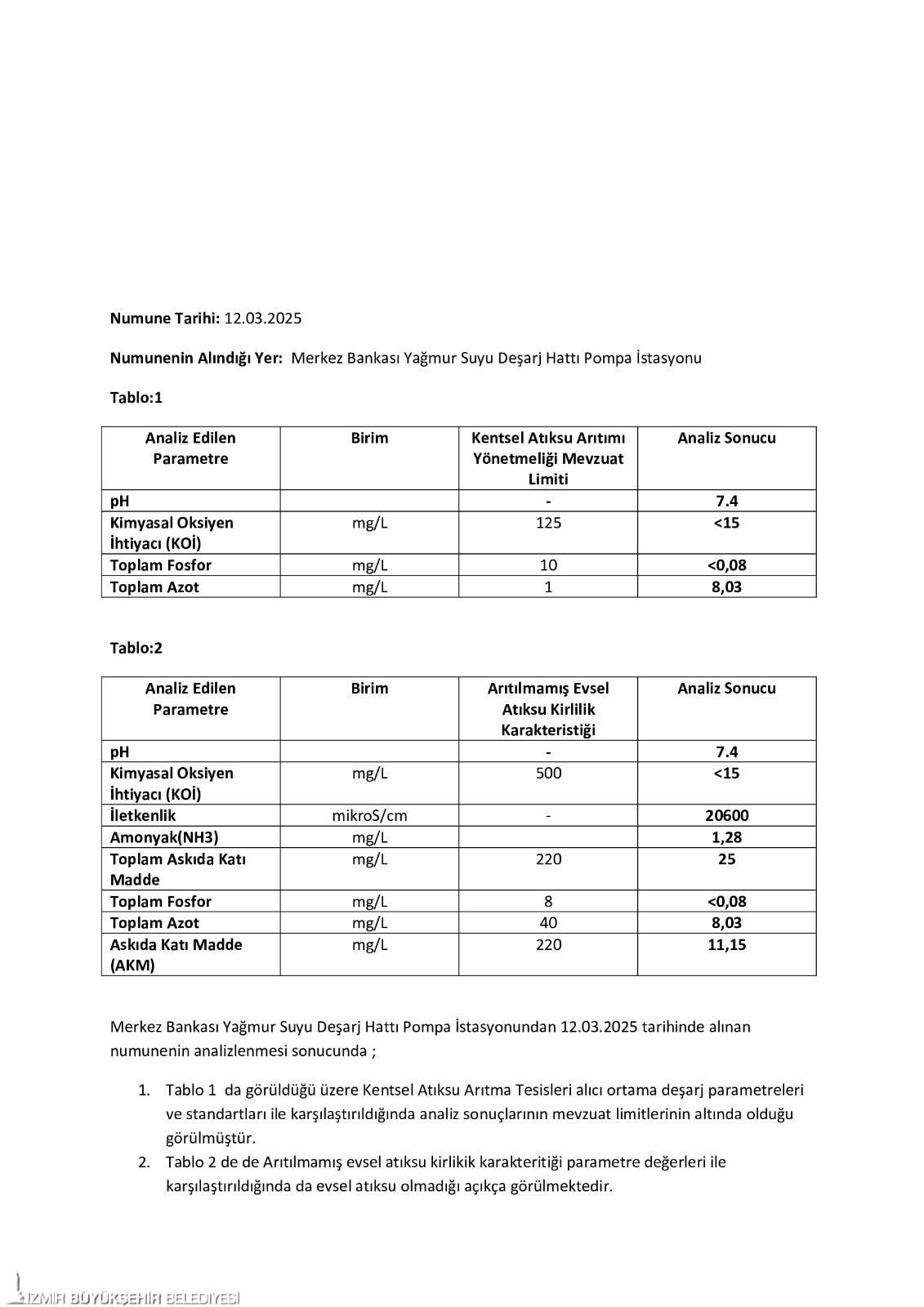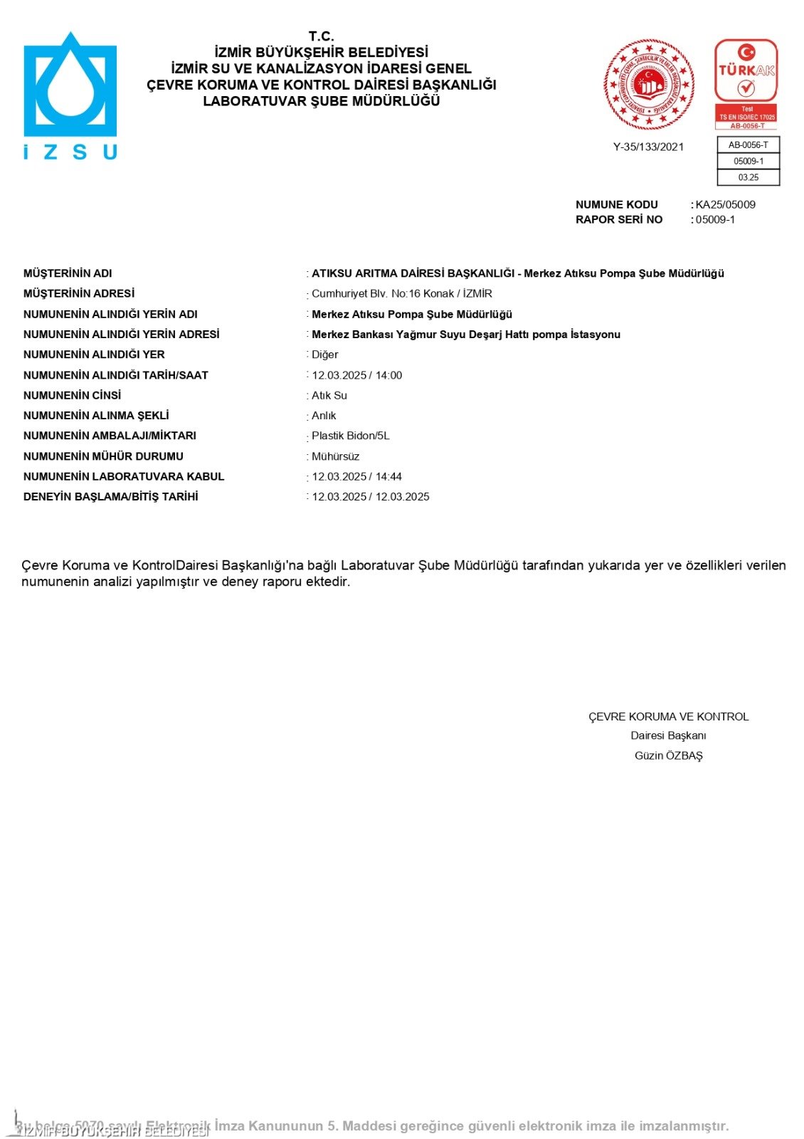 İzmir Büyükşehir Belediyesi İZSU Genel Müdürlüğü Çevre Koruma ve Kontrol Dairesi Başkanlığı Laboratuvar Şube Müdürlüğü’nün Türk Akreditasyon Kurumu (TÜRKAK) tarafından akredite edilen laboratuvarlarında yapılan analizler, görüntülere yansıyan suyun evsel atık değil, yağmur suyu standartlarında olduğunu ortaya koydu.