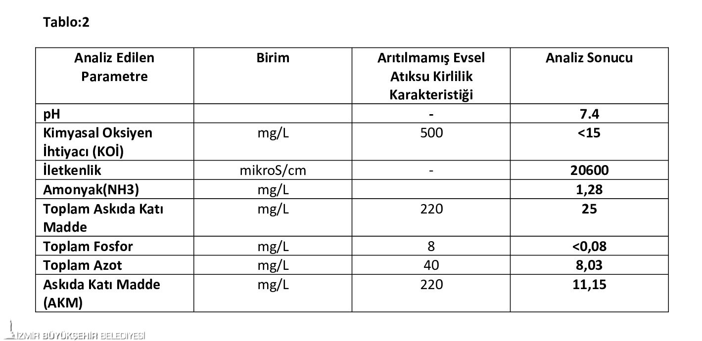 Laboratuvardan alınan analiz sonuçlarının değerlendirme bölümünde  “Arıtılmamış evsel atık su kirlilik karakteristiği parametre değerleri ile karşılaştırıldığında evsel atık su olmadığı açıkça görüldü. Ayrıca iletkenlik parametresinin analiz değerinden de görüldüğü üzere deniz suyu karakterinde de olduğu görülmekte” ifadelerine yer verildi.