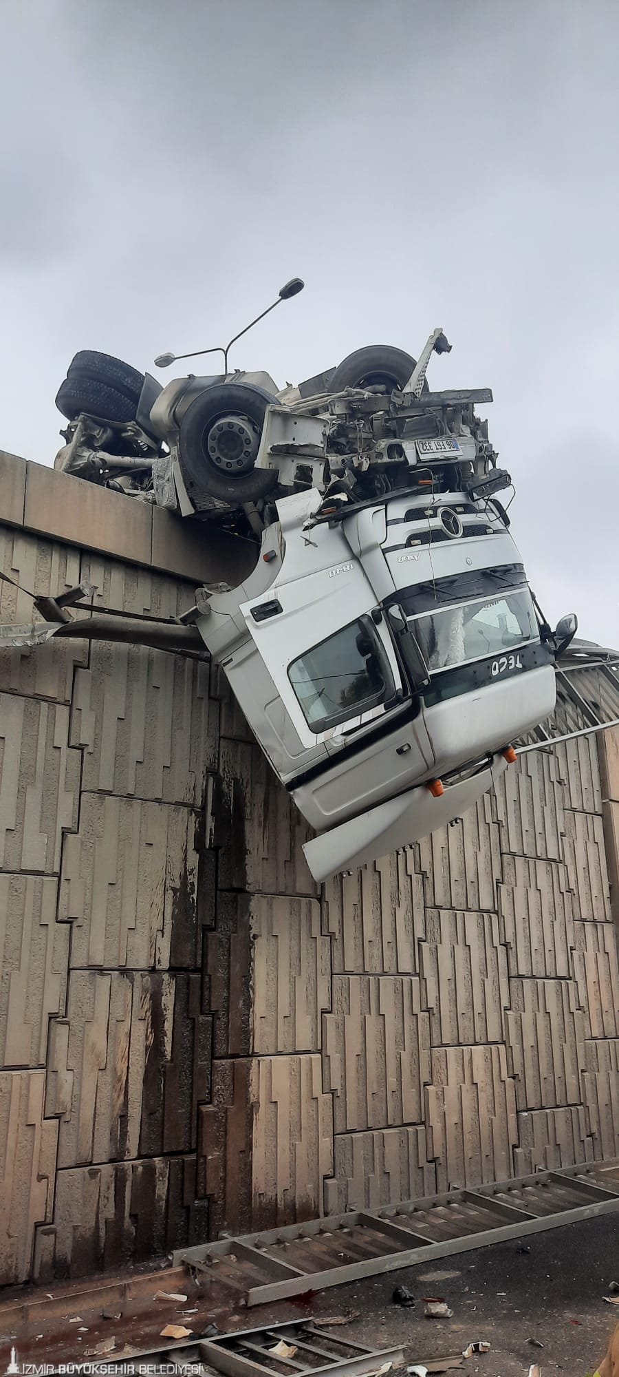 İzmir Büyükşehir Belediyesi İtfaiye Dairesi Başkanlığı ekipleri, bugün ölümle burun buruna gelen tır sürücüsünü kurtardı. Ankara Caddesi 4. Sanayi Sitesi girişindeki yolda kontrolden çıkan tır, yaklaşık 12 metrelik viyadükte asılı kaldı. Bornova Türkan Özilhan Devlet Hastanesi karşısında bulunan viyadük üzerinde, kupası sarkar vaziyette yan yatan tırın sürücüsü, araçta mahsur kaldı. İrfan Öngen isimli yurttaşın yardımına koşan itfaiye ekipleri, başarılı bir çalışma ile şoförü bulunduğu yerden kurtardı. Bilincinin açık olduğu öğrenilen sürücü tedavi altına alındı.