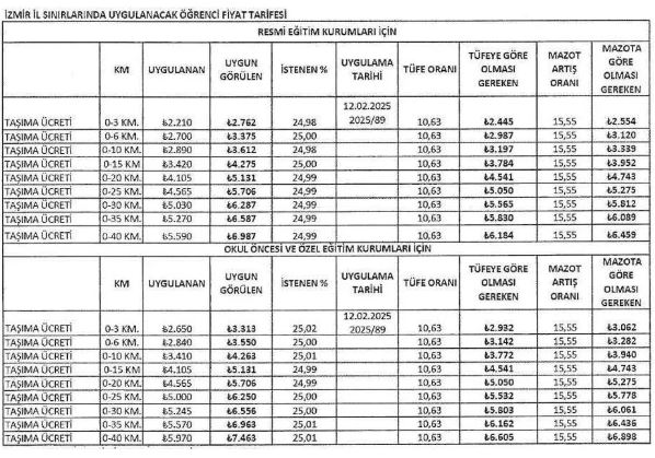 İzmir Büyükşehir Belediyesi Meclisi, 2025-2026 eğitim öğretim yılı öğrenci servis fiyat tarifesini onayladı. Buna göre, en yakın mesafe olan 0-3 kilometre devlet okullarında 2 bin 762 TL, anaokulları ve özel okullarda ise 3 bin 313 TL olarak belirlendi.