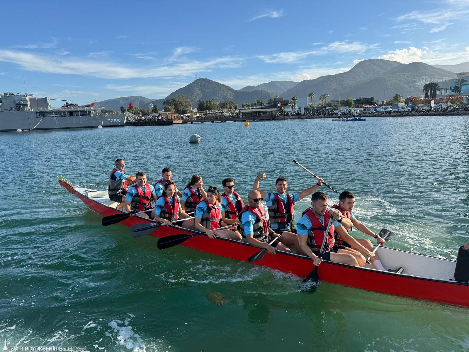 İzmir Büyükşehir Belediyesi tarafından bu yıl üçüncüsü düzenlenen Dragon Tekne Yarışması, renkli görüntülere sahne oldu. Belediye çatısı altındaki birimlerin İzmir Körfezi’nde kürek çektiği yarış, izleyenlere de heyecanlı anlar yaşattı. 28 takımın katıldığı yarış, kıyasıya rekabetin yanı sıra centilmenlik ruhunun da en güzel örneklerine sahne oldu. Balçova İnciraltı sahilinde yerini alan takımlar 250 metrelik parkurda, kazanmak için kürek çekti.