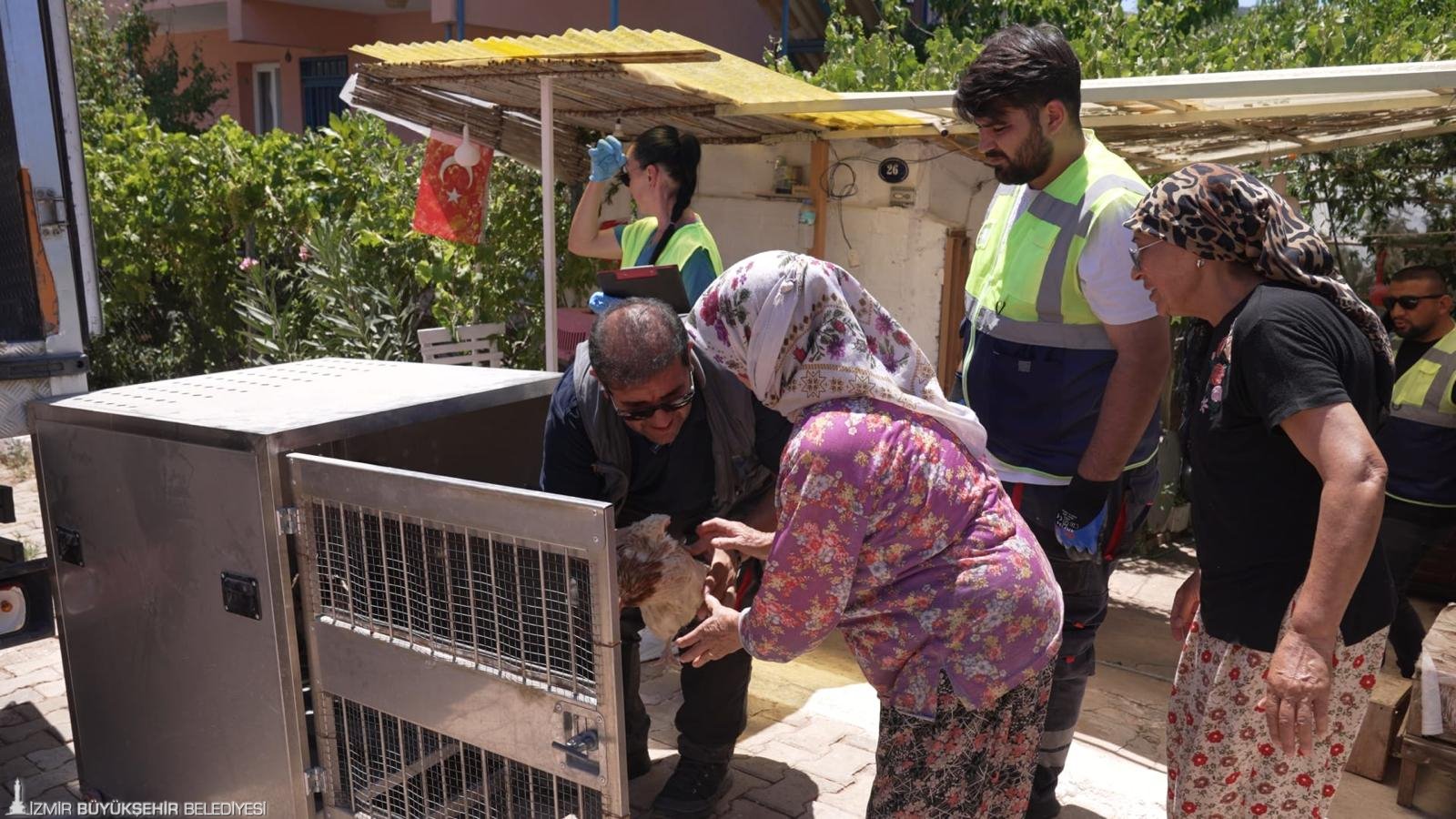 İzmir Büyükşehir Belediyesi Veteriner İşleri Dairesi Başkanlığı Hayvan Sağlığı Şube Müdürlüğü ekipleri, günlerdir kenti etkileyen yangınlarda yurttaşların yardımına koşuyor. Boşaltılan yerleşim yerlerinde bulunan hayvanların tahliyesini sağlayan ekipler, sahipsiz kalan canlıları da alevlerin arasından kurtarıyor. Yoğun şekilde İzmir’in dört bir yanında görev yapan ekipler, sayısız canlıyı kurtararak herkese umut oldu. İyi haber ise Seferihisar’dan geldi. Orman yangınlarının etkilediği yerleşim yerlerinden biri olan Orhanlı Mahallesi’nin tahliye edildiği sırada Tire’de bulunan Seher Beydağ’a İzmir Büyükşehir Belediyesi yardım etti. Ekipler tarafından 100 tavuk, 2 bıldırcın, kedi ve köpek hemen tahliye edildi. 29 Haziran’da alınan hayvanlar, bugün teslim edildi.