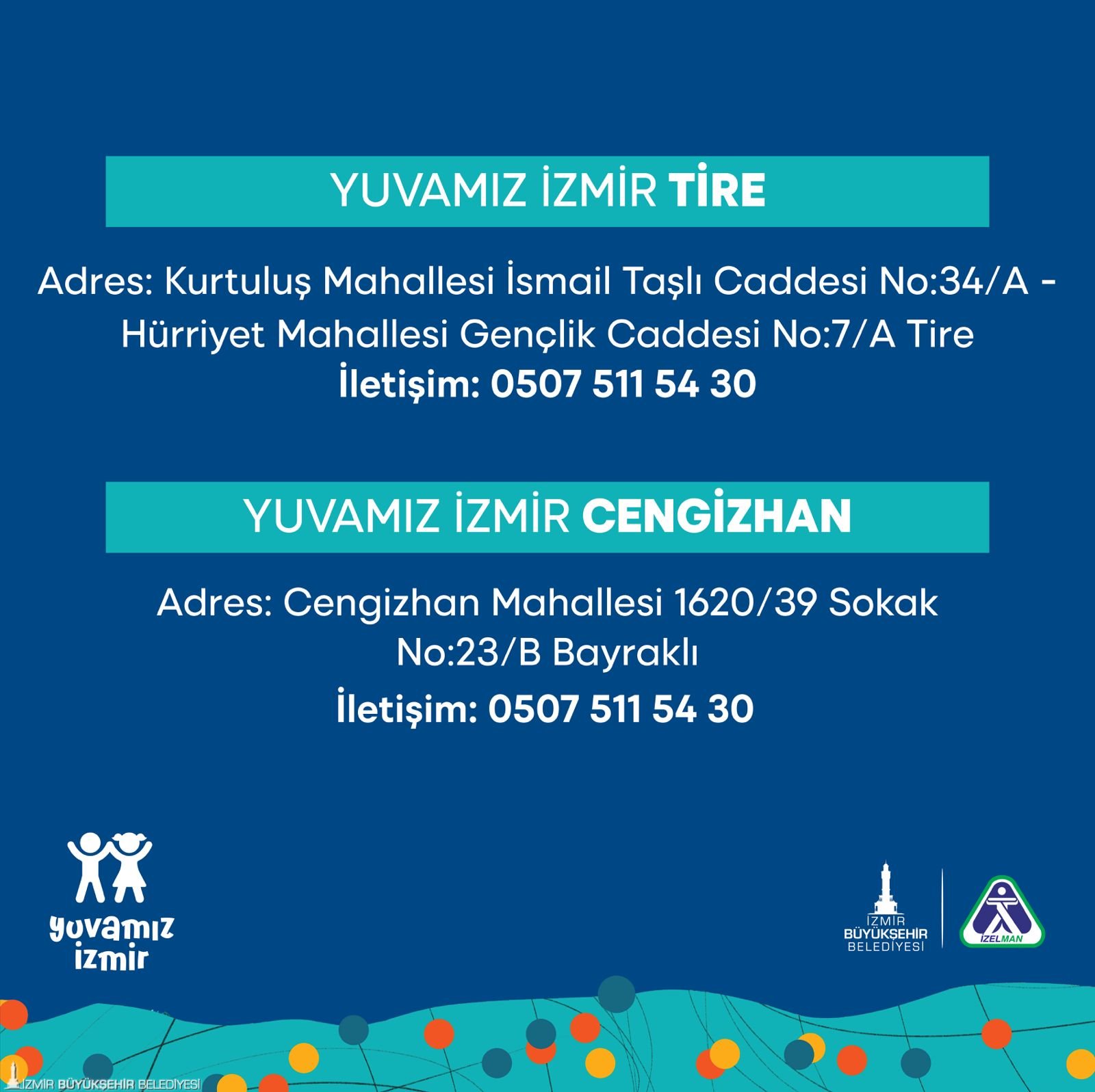 Yuvamız İzmir Tire, Kurtuluş Mahallesi İsmail Taşlı Caddesi No: 34/A ve Hürriyet Mahallesi Gençlik Caddesi No: 7/A adreslerinde açılacak. Yuvamız İzmir Cengizhan ise Cengizhan Mahallesi 1620/29 Sokak No23/B Bayraklı adresinde hizmete girecek. Merkezlere ön kayıt yaptırmak isteyen aileler 0507 511 54 30 numaralı telefonu arayabiliyor.