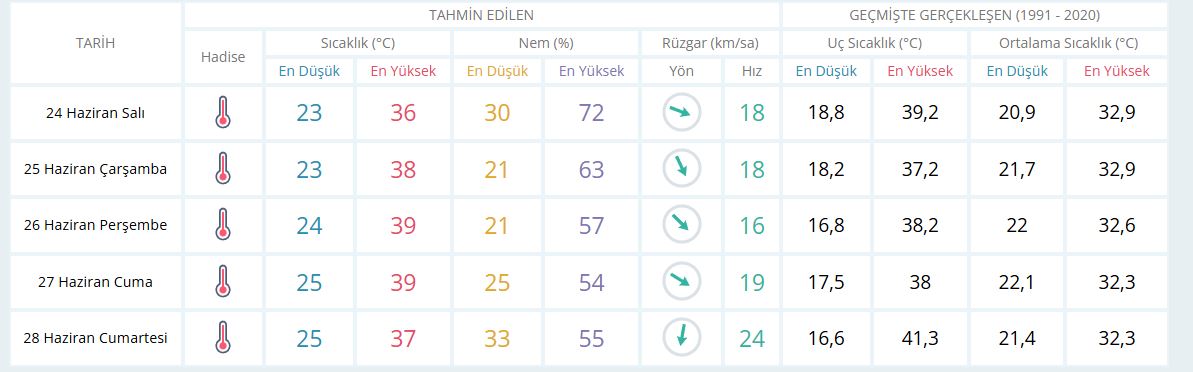 Meteoroloji Genel Müdürlüğü’nün verilerine göre İzmir’de yeni hafta, mevsim normallerinin oldukça üzerinde seyreden aşırı sıcaklarla geçecek. 24-28 Haziran tarihleri arasında kent genelinde hava sıcaklıklarının 39 dereceye kadar çıkması beklenirken, bazı ilçelerde hissedilen sıcaklıkların 43 dereceyi bulacağı tahmin ediliyor.