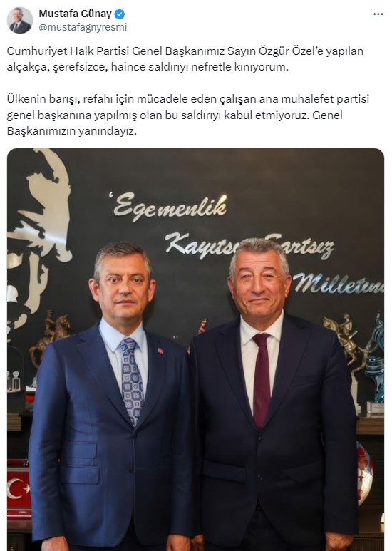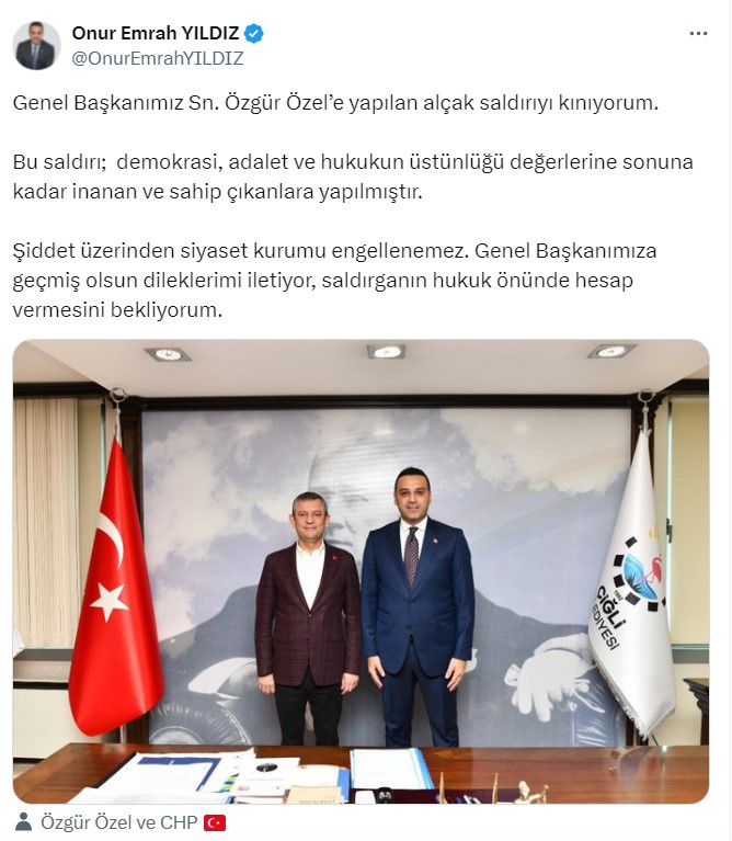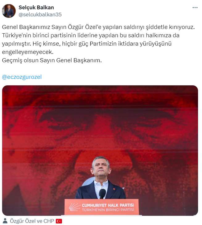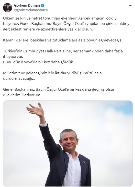 Ülkemize kin ve nefret tohumları ekenlerin gerçek amacını çok iyi biliyoruz. Genel Başkanımız Sayın Özgür Özel’e yapılan bu çirkin saldırıyı gerçekleştirenlere ve azmettirenlere yazıklar olsun.Karanlık ellere, baskılara ve tutuklamalara asla boyun eğmeyeceğiz. Türkiye’nin Cumhuriyet Halk Partisi’ne, her zamankinden daha fazla ihtiyacı var. Bunu dün Konya’da bir kez daha gördük. Milletimiz ve geleceğimiz için iktidar yürüyüşümüzü asla durdurmayacağız. Genel Başkanımız Sayın Özgür Özel’e bir kez daha geçmiş olsun dileklerimi iletiyorum.