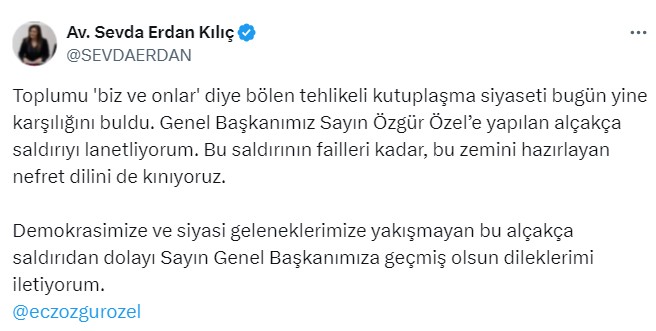Toplumu ‘biz ve onlar’ diye bölen tehlikeli kutuplaşma siyaseti bugün yine karşılığını buldu. Genel Başkanımız Sayın Özgür Özel’e yapılan alçakça saldırıyı lanetliyorum. Bu saldırının failleri kadar, bu zemini hazırlayan nefret dilini de kınıyoruz.Demokrasimize ve siyasi geleneklerimize yakışmayan bu alçakça saldırıdan dolayı Sayın Genel Başkanımıza geçmiş olsun dileklerimi iletiyorum.@eczozgurozel
