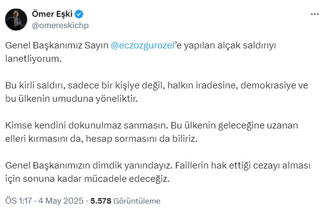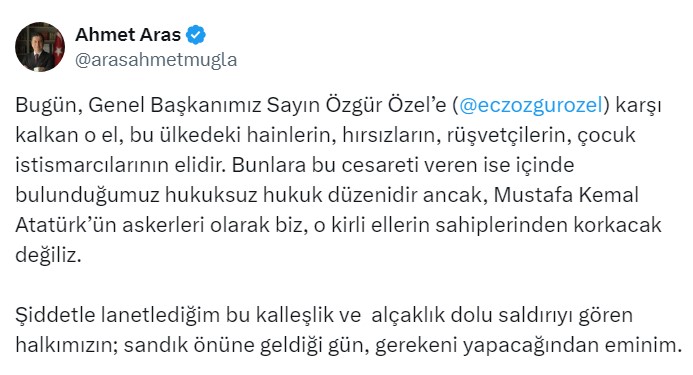 Bugün, Genel Başkanımız Sayın Özgür Özel’e (@eczozgurozel) karşı kalkan o el, bu ülkedeki hainlerin, hırsızların, rüşvetçilerin, çocuk istismarcılarının elidir. Bunlara bu cesareti veren ise içinde bulunduğumuz hukuksuz hukuk düzenidir ancak, Mustafa Kemal Atatürk’ün askerleri olarak biz, o kirli ellerin sahiplerinden korkacak değiliz. Şiddetle lanetlediğim bu kalleşlik ve alçaklık dolu saldırıyı gören halkımızın; sandık önüne geldiği gün, gerekeni yapacağından eminim.