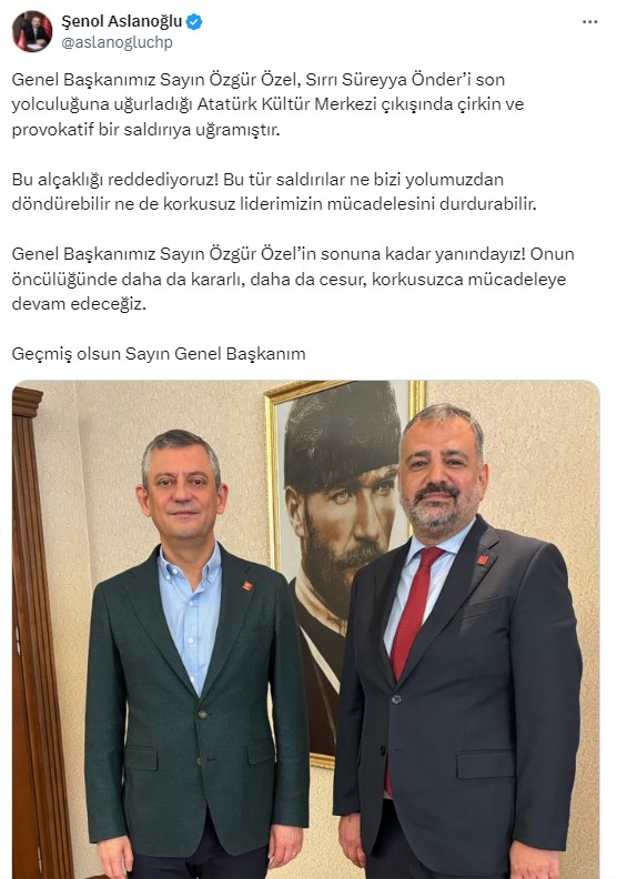 Genel Başkanımız Sayın Özgür Özel, Sırrı Süreyya Önder’i son yolculuğuna uğurladığı Atatürk Kültür Merkezi çıkışında çirkin ve provokatif bir saldırıya uğramıştır. Bu alçaklığı reddediyoruz! Bu tür saldırılar ne bizi yolumuzdan döndürebilir ne de korkusuz liderimizin mücadelesini durdurabilir. Genel Başkanımız Sayın Özgür Özel’in sonuna kadar yanındayız! Onun öncülüğünde daha da kararlı, daha da cesur, korkusuzca mücadeleye devam edeceğiz. Geçmiş olsun Sayın Genel Başkanım
