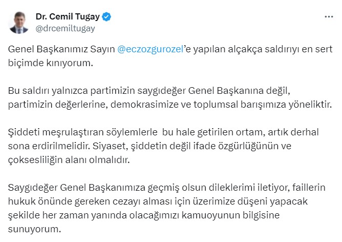 @eczozgurozel’e yapılan alçakça saldırıyı en sert biçimde kınıyorum. Bu saldırı yalnızca partimizin saygıdeğer Genel Başkanına değil, partimizin değerlerine, demokrasimize ve toplumsal barışımıza yöneliktir. Şiddeti meşrulaştıran söylemlerle bu hale getirilen ortam, artık derhal sona erdirilmelidir. Siyaset, şiddetin değil ifade özgürlüğünün ve çoksesliliğin alanı olmalıdır. Saygıdeğer Genel Başkanımıza geçmiş olsun dileklerimi iletiyor, faillerin hukuk önünde gereken cezayı alması için üzerimize düşeni yapacak şekilde her zaman yanında olacağımızı kamuoyunun bilgisine sunuyorum.