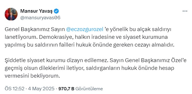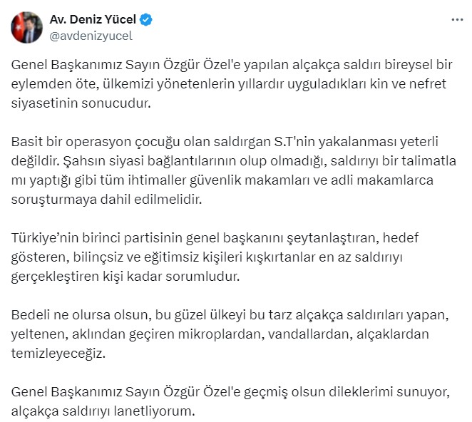 Genel Başkanımız Sayın @eczozgurozel ’e yönelik bu alçak saldırıyı lanetliyorum. Demokrasiye, halkın iradesine ve siyaset kurumuna yapılmış bu saldırının failleri hukuk önünde gereken cezayı almalıdır. Şiddetle siyaset kurumu dizayn edilemez. Sayın Genel Başkanımız Özel’e geçmiş olsun dileklerimi iletiyor, saldırganların hukuk önünde hesap vermesini bekliyorum.