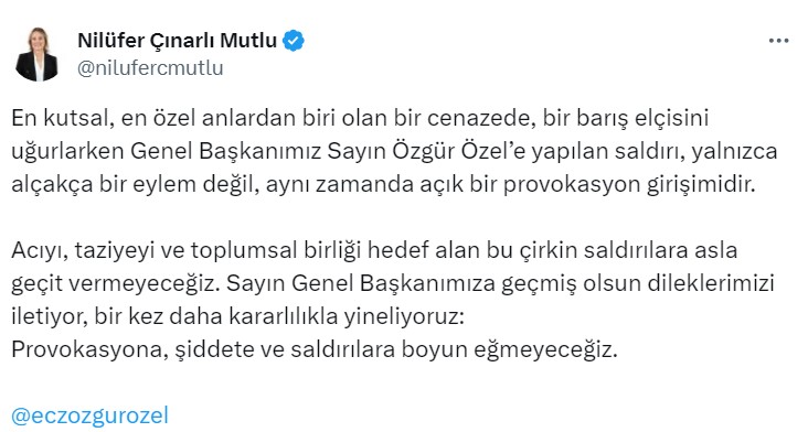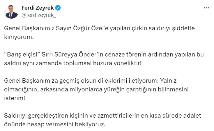 Genel Başkanımız Sayın Özgür Özel’e yapılan çirkin saldırıyı şiddetle kınıyorum. “Barış elçisi” Sırrı Süreyya Önder’in cenaze törenin ardından yapılan bu saldırı aynı zamanda toplumsal huzura yöneliktir! Genel Başkanımıza geçmiş olsun dileklerimi iletiyorum. Yalnız olmadığının, arkasında milyonlarca yüreğin çarptığının bilinmesini isterim! Saldırıyı gerçekleştiren kişinin ve azmettiricilerin en kısa sürede adalet önünde hesap vermesini bekliyoruz.