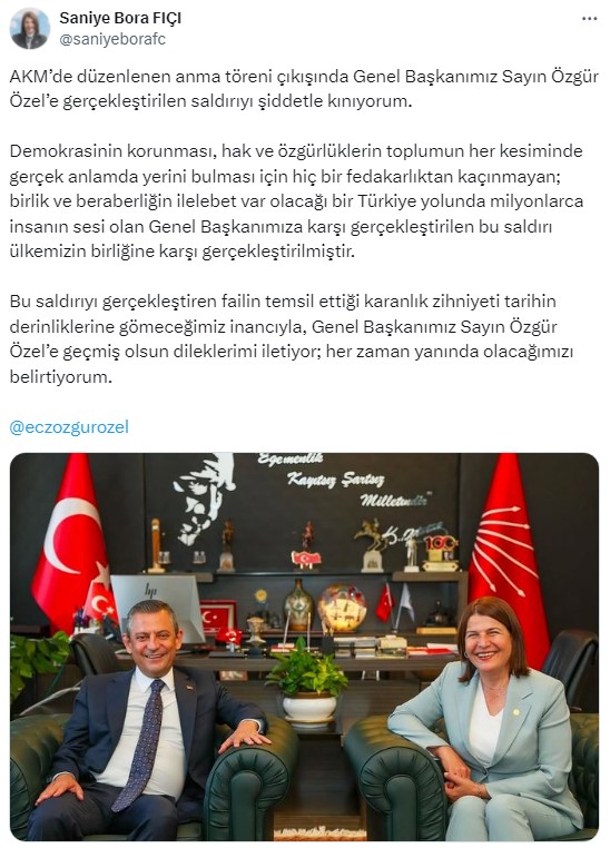 AKM’de düzenlenen anma töreni çıkışında Genel Başkanımız Sayın Özgür Özel’e gerçekleştirilen saldırıyı şiddetle kınıyorum. Demokrasinin korunması, hak ve özgürlüklerin toplumun her kesiminde gerçek anlamda yerini bulması için hiç bir fedakarlıktan kaçınmayan; birlik ve beraberliğin ilelebet var olacağı bir Türkiye yolunda milyonlarca insanın sesi olan Genel Başkanımıza karşı gerçekleştirilen bu saldırı ülkemizin birliğine karşı gerçekleştirilmiştir.Bu saldırıyı gerçekleştiren failin temsil ettiği karanlık zihniyeti tarihin derinliklerine gömeceğimiz inancıyla, Genel Başkanımız Sayın Özgür Özel’e geçmiş olsun dileklerimi iletiyor; her zaman yanında olacağımızı belirtiyorum.