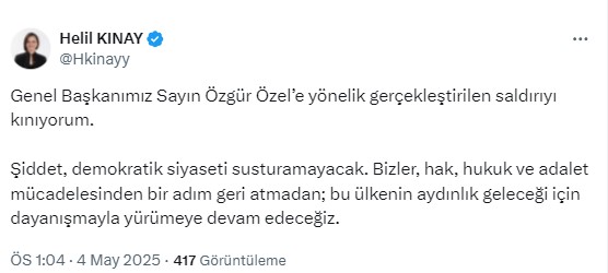 Genel Başkanımız Sayın Özgür Özel’e yönelik gerçekleştirilen saldırıyı kınıyorum. Şiddet, demokratik siyaseti susturamayacak. Bizler, hak, hukuk ve adalet mücadelesinden bir adım geri atmadan; bu ülkenin aydınlık geleceği için dayanışmayla yürümeye devam edeceğiz.