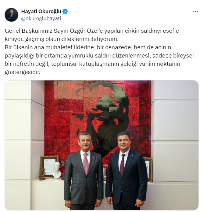 Genel Başkanımız Sayın Özgür Özel’e yapılan çirkin saldırıyı esefle kınıyor, geçmiş olsun dileklerimi iletiyorum. Bir ülkenin ana muhalefet liderine, bir cenazede, hem de acının paylaşıldığı bir ortamda yumruklu saldırı düzenlenmesi, sadece bireysel bir nefretin değil, toplumsal kutuplaşmanın geldiği vahim noktanın göstergesidir.