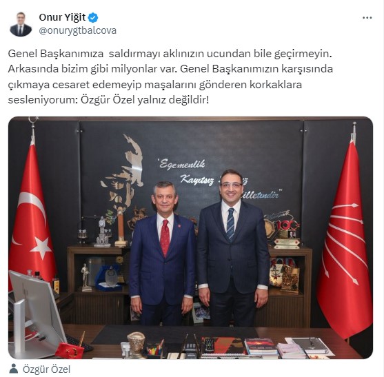 Genel Başkanımıza saldırmayı aklınızın ucundan bile geçirmeyin. Arkasında bizim gibi milyonlar var. Genel Başkanımızın karşısında çıkmaya cesaret edemeyip maşalarını gönderen korkaklara sesleniyorum: Özgür Özel yalnız değildir!