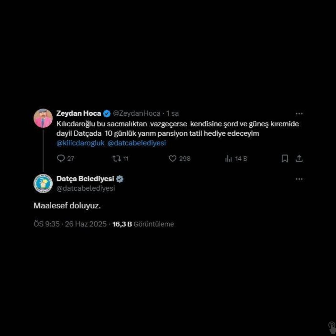 Bir sosyal medya kullanıcısının, Kemal Kılıçdaroğlu’na Datça’da 10 günlük tatil hediye edeceğini belirtmesi üzerine Datça Belediyesi’nin hesabından söz konusu paylaşımın altına “Doluyuz” yazılmıştı.