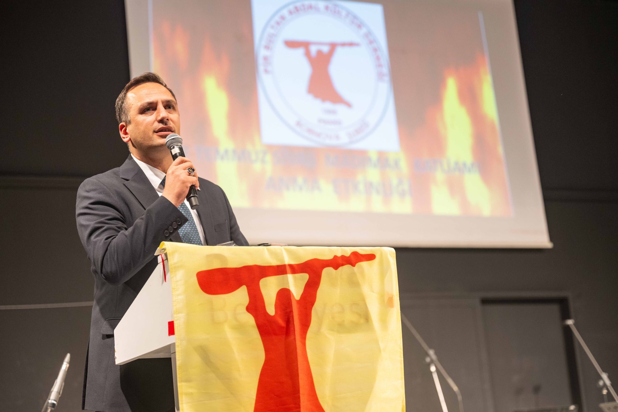 Türkiye’nin tarihi boyunca iki farklı çizginin mücadelesine tanıklık ettiğini dile getiren Başkan Eşki, “Bir yanda, “Yâr’in yanağından gayrı her şeyde ortağız” diyen Şeyh Bedreddin’in, “Dönen dönsün, ben dönmem yolumdan” diyen Pir Sultan Abdal’ın, bilim için rasathane kuran Takiyüddin Efendi’nin Türkiye’si, diğer yanda onları idam edenlerin, seslerini susturanların, rasathaneyi topa tutanların Türkiye’si. Bugün de değişen pek bir şey yok. Bir tarafta Denizlerin, Yusufların, Mahir’lerin Türkiye’si, diğer tarafta darbecilerin Türkiye’si var. Bu nedenle, direnmekten başka çaremiz, kazanmaktan başka yolumuz yok” dedi.