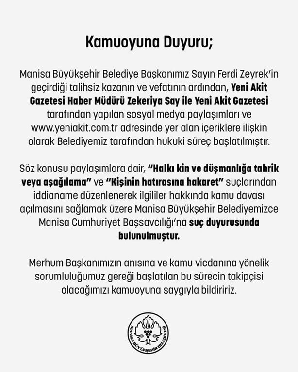 Manisa Büyükşehir Belediyesi, Belediye Başkanı Ferdi Zeyrek’in vefatının ardından Yeni Akit ve Haber Müdürü Zekeriya Say'ın sosyal medya paylaşımları ve internet sitesi içerikleri nedeniyle hukuki süreç başlattığını duyurdu.