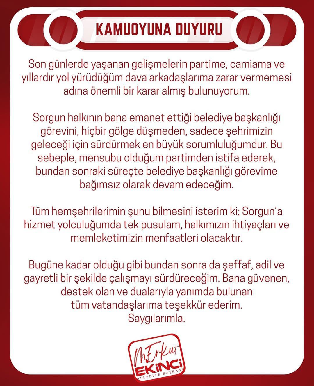 Sorgun halkının bana emanet ettiği belediye başkanlığı görevini, hiçbir gölge düşmeden, sadece şehrimizin geleceği için sürdürmek en büyük sorumluluğumdur. Bu sebeple, mensubu olduğum partimden istifa ederek, bundan sonraki süreçte belediye başkanlığı görevime bağımsız olarak devam edeceğim.