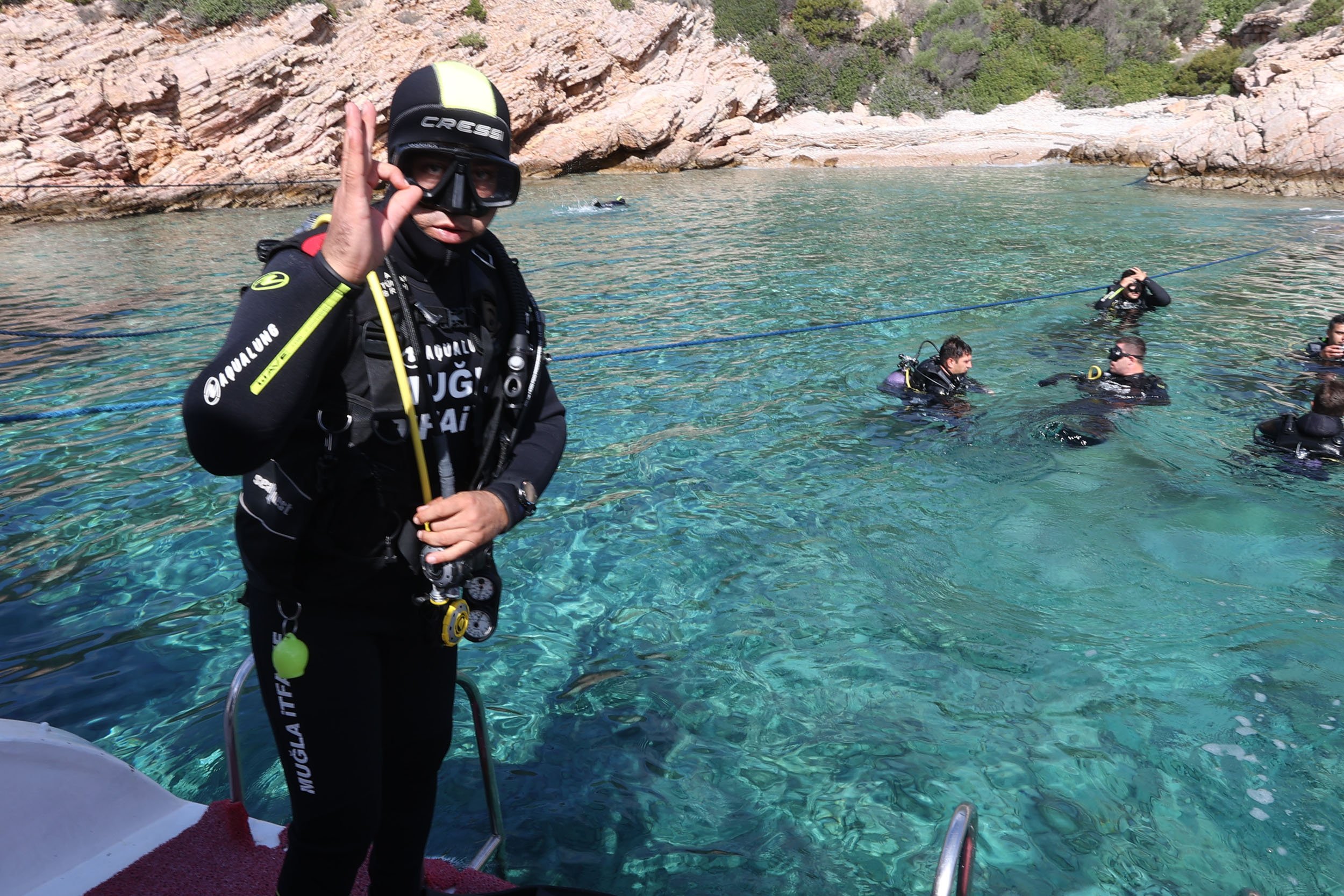 Muğla Büyükşehir Belediyesi, İtfaiye Dairesi Başkanlığı Dalış Amiri Ali Üstünkaya “Muğla Büyükşehir Belediyesi olarak il ve ilçelerimiz sınırları içerisinde denizlerimizde , karasularımızda oluşabilecek her hangi bir arama kurtarmaya müdahil olmak amacı ile su altı ve su üstü arama kurtarma birimini kurduk. Ekibimizde 14 profesyonel dalgıç bulunuyor. Ekibimiz operasyonlara katılmak için uzun bir eğitim sürecinden geçti. Eğitimlerimiz bu gün itibarıyla tamamlandı. Muğla Büyükşehir Belediye Başkanımız Sayın Ahmet Aras öncülüğünde kurulan ekibimiz ilimiz sınırları içerisinde oluşabilecek su altı ya da su üstü kazalara ve olaylara müdahale etmek için hazırdır” dedi.