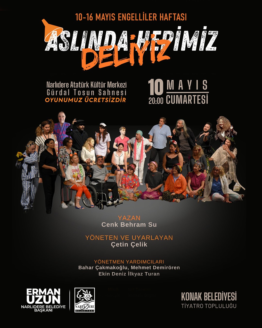 Narlıdere Belediyesi, 10-16 Mayıs Dünya Engelliler Haftası kapsamında farkındalık yaratmak, eşit yaşam hakkına dikkat çekmek ve engelli bireylerin başarı hikâyelerini görünür kılmak amacıyla iki özel etkinlik düzenleyecek. Engelliler Haftası etkinliklerinin ilki, 10 Mayıs Cumartesi günü saat 20.00’de Narlıdere Belediyesi Atatürk Kültür Merkezi Tiyatro Salonu’nda sahnelenecek olan “Aslında Hepimiz Deliyiz” adlı tiyatro oyunu olacak. Konak Belediyesi Tiyatro Topluluğu’nun sahneleyeceği oyun öncesinde, kendisi de engelli bir birey olan Erkan Kızıldağ, engelli bireylerin yaşadığı sorunları anlatan bir konuşma yapacak.