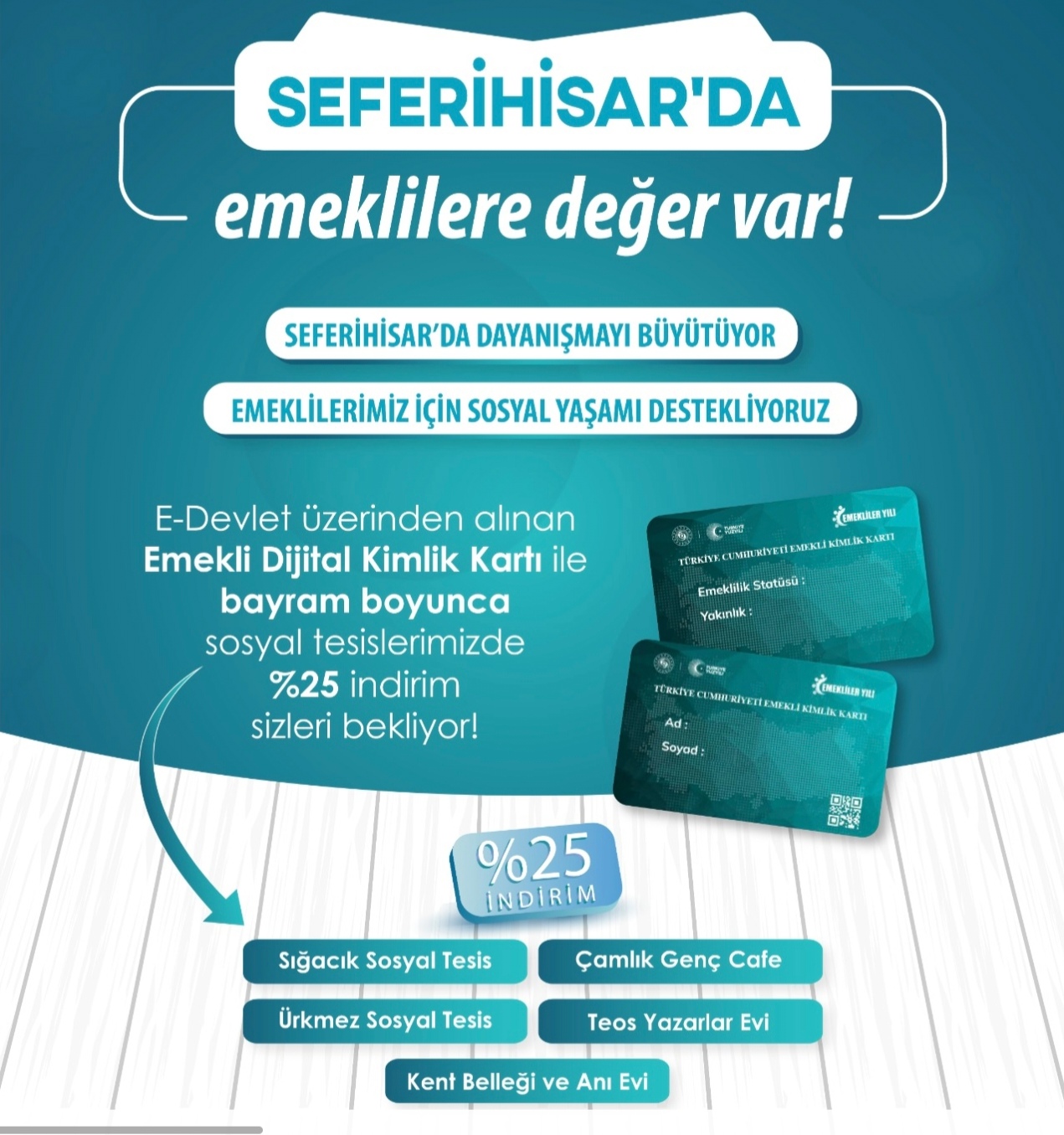 Uygulama kapsamında indirim; Sığacık Sosyal Tesis, Ürkmez Sosyal Tesis, Kent Belleği ve Anı Evi, Çamlık Genç Cafe ve Teos Yazarlar Evi’nde geçerli olacak. Emekliler, E-Devlet üzerinden alacakları Emekli Kimlik Kartı’nı ibraz ederek bu tesislerde sunulan hizmetlerden indirimli şekilde faydalanabilecek.