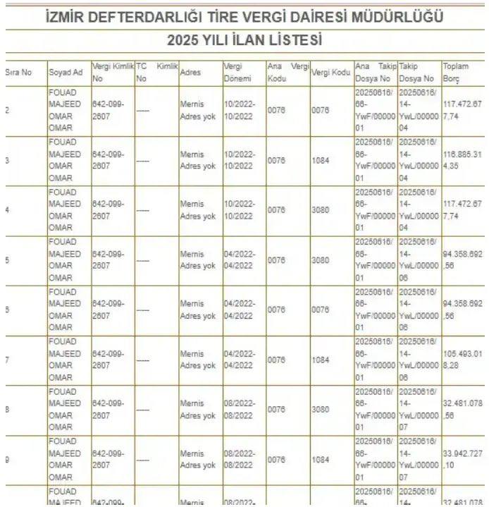 Tire Vergi Dairesi, vergi kimlik numarası 642-099/2607 olan ve tütün ticareti yaptığı belirlenen Fouad Majeed Omar Omar adlı yabancı uyruklu mükellef hakkında işlem başlattı. 2022 yılına ait ÖTV borcunu ödemeyen mükellefin, ana para, faiz ve vergi ziyaı cezası dahil toplam borcunun yaklaşık 900 milyon TL seviyesine ulaştığı öğrenildi.